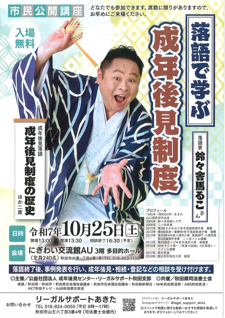 令和7年10月25日(土)、にぎわい交流館AU 3階多目的ホールにて鈴々舎馬るこ師匠による成年後見落語を開催します。